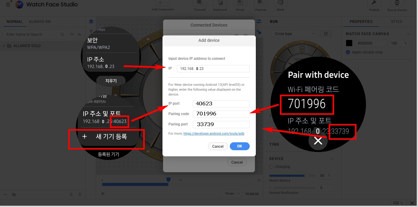 5. 위에 기억한 IP 입력 --> 무선 디버깅에 있는 포트 입력 --> 새기기등록을 누르면 우측과 같이 페어링코드가 나옴